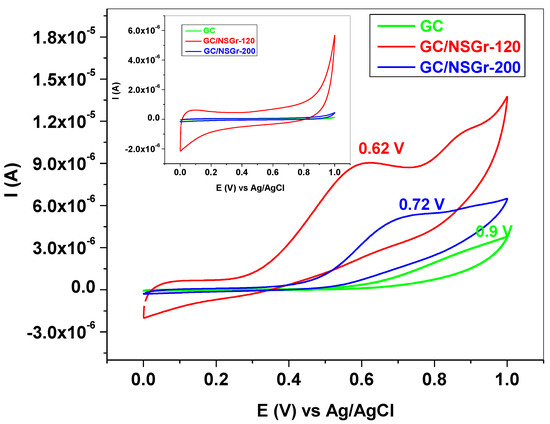 The electrochemical performances of bare and graphene-modified electrodes in L-cysteine detection were next tested. Figure 10 presents the CVs recorded with bare GC (green), GC/NSGr-120 (red), and GC/NSGr-200 (blue) electrodes in a solution containing 10−3 M L-cysteine (pH 6 PBS supporting electrolyte). There are marked differences between the three electrodes, in terms of both peak potential and peak current. In the case of the bare GC electrode, no oxidation peak was recorded, indicating that L-cysteine molecules cannot be easily oxidized on its surface. For GC/NSGr-120 (red) and GC/NSGr-200 (blue) electrodes, the corresponding CVs exhibit broad oxidation peaks at around +0.62 and +0.72 V, respectively, proving the electrocatalytic effect of NS-doped graphene. As expected, the effect is better in the case of NSGr-120 sample, which may be related to the considerably lower charge-transfer resistance. The inset shows the CVs recorded with each electrode in pH 6 PBS electrolyte.