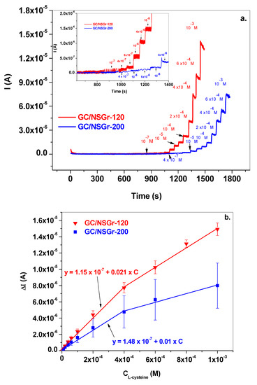 Next, the amperometric technique was employed to further test the L-cysteine detection performance of the electrodes. Figure 11a shows the amperometric curves recorded with graphene-modified electrodes in pH 6 PBS after the addition of known concentrations of L-cysteine. The corresponding calibration plots obtained after the subtraction of the background signal are presented in Figure 11b (the mean value from three measurements). Between the measurements, each electrode was immersed in double-distilled water for 20 min and then cycled in pH 6 PBS (50 cycles; 50 mVs−1). It is interesting to mention that in the case of the GC/NSGr-200 electrode (blue), the plot significantly deviates from linearity above 4 × 10−4 M, and it exhibits the largest standard error. This proves a stronger interaction between the oxidized molecules and the graphene surface [41].