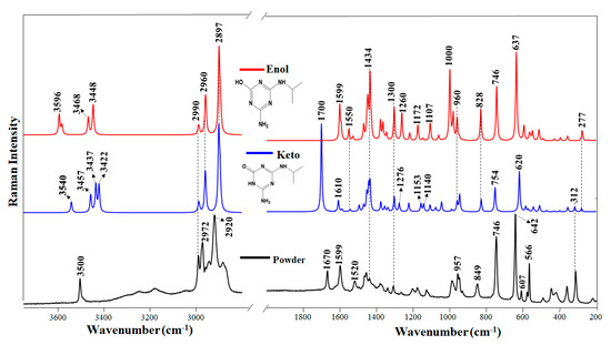The analysis of the calculated Raman vibrational spectra of enol and keto DEHA suggests that the solid atrazine derivative has contributions from both the keto and enol structures. The intense band at 3500 cm−1 is attributed to the ν(O-H) motion, while the broad bands seen in the 3000–3400 cm−1 can be attributed to the ν(N-H) motions, that are involved in H-bonds. The presence of intense bands at 3500, 1599, 746, and 642 cm−1 points out the presence of the enol form, since they correlate well with similar bands in the enol calculated spectrum. On the other hand, the presence of bands at 1670, 1520, and 607 indicates that the keto form is also contributing to the final structure of DEHA in the solid state.