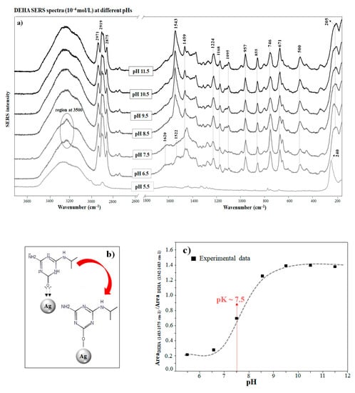 The variation of the SERS intensity of DEHA with the pH is plotted in Figure 2c. As can be seen, the SERS increases as the pH rises, and this is related to the increasing adsorption ability of DEHA at alkaline pH. In addition, this is also due to the higher affinity of the enol form, which is more probable at alkaline pH due to the consequent enolization and the silver surface. The sigmoidal curve plotted in Figure 2c shows an inflection at pH 7.5 that may correspond to the pH at which the enolization starts to grow significantly.