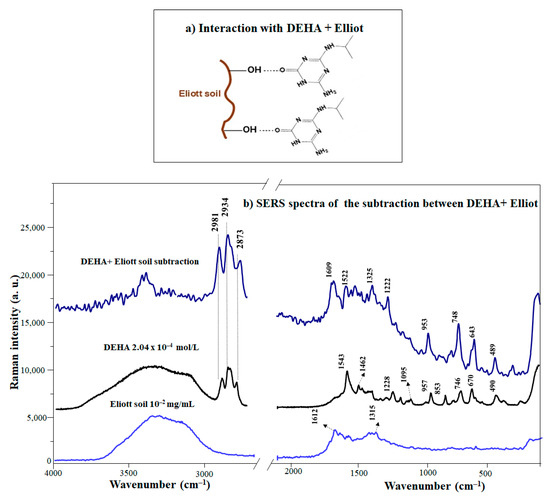 Triazine has shown high affinities with both humic and fulvic acids [18,50,51,52,53]. The interaction ability of humic substances regarding pesticides is enhanced due to the presence of both highly polar and aliphatic groups in their structure [18]. These functional groups present in HS are believed to be the key factor in the dynamics of triazines in soil through the interaction by different mechanisms, both hydrophilic and hydrophobic (Figure 3a). A general description of the interactions between the DEHA and HS is complicated due to their extreme heterogeneity; for this reason, the studies were focused on two IHSS standards: Elliot soil humic acids (EHA) and the Leonaredite humic acids (LHA). EHA are characterized by a high content of acidic functional groups [54,55] and aliphatic moieties compared to LHA, where there is a higher content of aromatic moieties than aliphatic ones [56]. Thus, these HS represent a good reference model for studying the interaction of triazine products with two different structural organic substances. Figure 3b displays the SERS spectrum of DEHA and the difference spectrum of the DEHA/EHA complex (displayed in Figure S2) and that of non-complexed DEHA (at a concentration 10−4 M). The pH of all suspensions was maintained at 8.5 in order to promote the interaction between DEHA and humic substances.