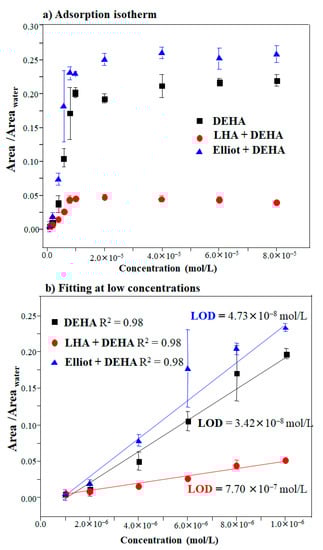 In the present study, the limit of detection (LOD) was calculated by considering DEHA in the absence and presence of LHA or EHA, respectively, and testing whether humic acids could enhance or diminish the sensitivity of DEHA detection. In order to deduce both the sensitivity and LOD of the SERS analysis of DEHA, the spectra of DEHA were recorded for concentrations ranging from 2.04 × 10−6 to 1.63 × 10−4 mol/L on AgNPs nanoparticles (Figure S4) at pH 8.5. This pH value was selected because it corresponds to pH conditions at which the SERS of DEHA can be measured at optimal intensity for all the analyzed cases. The SERS intensity versus concentration curve (Figure 5) was obtained by calculating the ratio between the area of the 1483–1575 cm−1 region and the integrated area between 3020 and 3750 cm−1 at different DEHA concentrations regarding Figures S2–S4. The curve was plotted considering three experimental measures for every concentration. The curves of Figure 5a can be adjusted to Langmuir isotherms [59,60], where the concentration-dependent calibration curve can be fitted to the following expression: