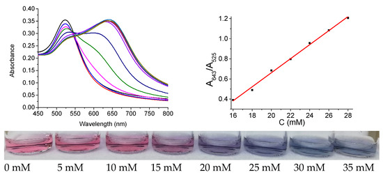 UV–Vis titrations of GNP1 using increasing amounts of GHB were made in deionized water (see Figure 3). A decrease of the band at 525 nm and an enhancement of the band at 643 nm was observed as the concentration of GHB increased. These changes induced a gradual change in the color of the suspension, which could be observed by the naked eye.