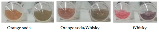 The last step was to test sensor GNP1 in real samples. For this, detection of GHB in some beverages, such as alcoholic drinks and soft drinks (alone and mixed with some distilled drink), was studied. Initially, the samples were spiked with GHB (70 mM final concentration) and mixed with GNP1 at room temperature (for further details, see “Section 2”). In all the tested cases, the changes were immediately observed by the naked eye. The results were satisfactory, as can be seen in Figure 4, and it was possible to distinguish between clean samples and samples adulterated with GHB (35 mM final concentration). Apart from orange soda and whisky, other samples were tested and compiled in Supplementary Materials Figure S11.