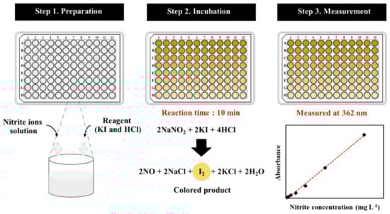 A few milliliters of nitrite ions solution were transferred into a microtube which contained 0.020 mol L−1 of hydrochloric acid and 0.050 mol L−1 of iodide ion solution. When a color change was observed by the naked eye, the mixture solution was dropped into wells of a 96-well microplate and mixed for 10 min. The absorbances detected by UV/Vis microplate spectrophotometer at a wavelength of 362 nm against a blank solution were recorded for each analysis. Note that the blank solution was prepared in a similar procedure but without nitrite ions. Figure 1 illustrates the scheme for the detection of nitrate, comprising the preparation, incubation, and measurement steps.