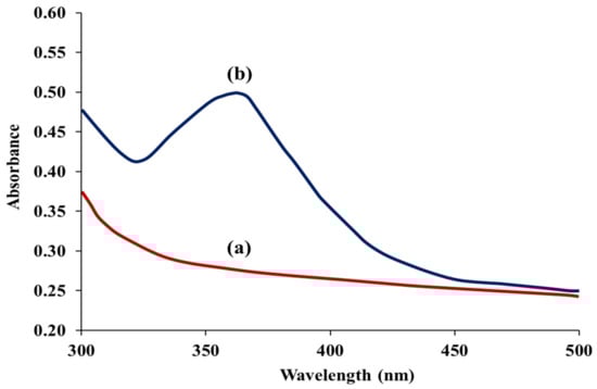 In an acidic condition, the iodide ion (I−) and nitrite ion (NO2−) functioned as a reducing and oxidizing agent, respectively. Iodide ion (I−) was oxidized to iodine (I2) by nitrite ion (NO2−), meanwhile nitrite ion (NO2−) was reduced to nitric oxide by iodide ion (I−) (2NaNO2 + 2KI + 4HCl → I2 + 2NO + 2NaCl + 2KCl + 2H2O). Upon the chemical reaction, the color of the mixture solution was changed from colorless to yellow, as observed by the naked eye. Such change was due to the oxidation of iodide ion (I−) to iodine (I2) [,,]. To obtain a good absorption by iodine, the incident wavelength of the spectrophotometer was adjusted from 300 to 500 nm, and Figure 2 shows the absorption spectra with and without the presence of nitrite. It was found that the maximum absorbance was at a wavelength of 362 nm [], and therefore this wavelength was selected for further experiments.