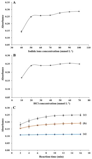The effect of the concentration levels of iodide ions on the absorbance of iodine was studied from 0.040 to 0.10 mol L−1 (Figure 3A). The absorbance increased with an increase in the iodide ion concentration from 0.040 to 0.050 mol L−1. At concentration levels greater than 0.050 mol L−1 up to 0.10 mol L−1, changes in absorbance were nearly negligible. Therefore, for subsequent experiments, a concentration of 0.050 mol L−1 of iodide ion was selected.