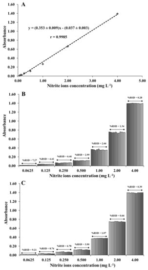To evaluate the precision of the method, the repeatability of intra-day and inter-day assays was studied with standard nitrite ions solutions at concentrations of 0.0625, 0.125, 0.250, 0.500, 1.00, 2.00, and 4.00 mg L−1. For the intra-day assay, the relative standard deviations (RSDs) of all concentration levels were reported in the range of 0.28% to 7.27% (six sets of measurements were investigated for each concentration (n = 3), giving 18 measurements for each concentration) (Figure 4B). For the inter-day assay, the measurements were repeated on six consecutive days, yielding relative standard deviations between 0.39% to 9.21% (Figure 4C). The repeatability of intra-day and inter-day assays were acceptable where respective RSD of 15%, 11%, and 7.3% were suggested for the concentration levels of 0.1 mg L−1, 1 mg L−1, and 10 mg L−1 according to the AOAC guidelines []. These results demonstrated the good precision of the spectrophotometric method.
