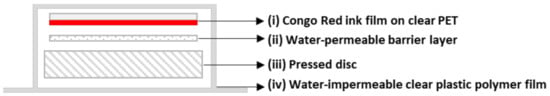 The Congo Red (i.e., CR; pKa = 4.0) [] ink film, i.e., (i) in Figure 1, was generated by adding 7 mL of a 30 mg/mL Congo Red aqueous solution to 20 g of a 15 wt% aqueous solution of polyvinyl alcohol, PVA (MW 146,00–186,000). A total of 3 mL of water was then added to the mixture, and the final solution was stirred for 1 h. The CR-based pH indicator film was then created by coating the ink onto a ca. 50 μm thick clear PET sheet using a K-bar (No. 3), producing a wet film thickness of ca. 24 µm that dried to a bright red, pH indicator film, ca. 3.0 µm thick. Once dried, the pH indicator film was cut into 12 mm (diameter) discs, using a computer controlled cutting machine (Cricut Explore Air 2, Amazon, London, UK) [], for subsequent incorporation into the HPP indicator, illustrated in Figure 1, as a pH-indicator film (on PET) disc.