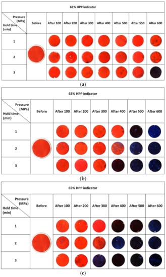 The silica-gel-based HPP indicators used in this work were prepared using three different acidified water loadings, i.e., 61, 63, and 65 wt%. The colour changes exhibited by each of these indicators when exposed to a wide variety of different pressures (100–600 MPa) and times (1–3 min), delivered using the HPP reactor, were recorded using digital photography, and the results of this work are illustrated in Figure 5a–c, respectively. A brief examination of these results reveals that the HPP indicator loaded with 61 wt% water only gave the expected colour change due to acidification of the pH indicator film, from red to blue, when exposed to the highest pressure and longest time used in this work, namely, 600 MPa for 3 min. As noted earlier, see Table S1 in ESI, the latter HPP conditions are those typically employed to pasteurise milk and soy smoothies [], orange juice [], and apple juice []. In contrast, the 63 wt% acidified water-loaded HPP indicator first produced the expected red-to-blue colour change when exposed to 400 MPa for 3 min, which are the typical HPP pressure/time conditions used to pasteurise cashew apple juice [] and aloe vera gel []. Finally, the 65 wt% acidified water-loaded HPP indicator first produced the expected red-to-blue colour change when exposed to 300 MPa for 3 min, which are the HPP conditions used in the HP pasteurisation of rabbit meat sausages [] and Cape gooseberry pulp []. The results illustrated in Figure 5 are typical for the three different HPP indicators used in this work and were reproduced using at least five different batches of each indicator. These results indicate that the indicator technology can be used to identify specific pressure (±<50 MPa) and application time (±<1 min) conditions associated with three commonly employed commercial HPP conditions, and so, under such conditions, could be used as a quality control tool for the HPP operator and/or the customer. Most importantly, this work shows that these HPP indicators are both high-pressure- and application-time-dependent, which are features largely absent from most if not all HPP indicators reported to date, see Table 1.