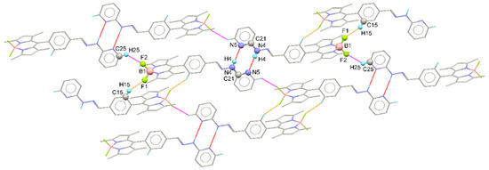 The intermolecular interactions within the crystals are displayed in Figure 3 and listed in Table S2. The N—H⋯N hydrogen bond is observed in the crystal structure of BODIPY-PH. The freely refined N—H bond distance is 0.89(2) Å, while the N4—H4⋯N5 bond angle is 177 (2)°. The N—H⋯N hydrogen bonds (red dash lines in Figure 3) linked two molecules related by an inversion center to a R22(8)-loop motif constructed from a H4—N4—C21—N5—H4—N4—C21—N5 synthon. Moreover, two different C—H⋯F interactions are observed. The first one (C25—H25⋯F2; magenta dash lines) joins the BODIPY-PH molecules related by a translational symmetry, while the second one (C15—H15⋯F1; orange dash lines) links the inversion-related BODIPY-PH molecules. According to the steric hindrance of the two perpendicular bulky groups, the centroids of aromatic rings are pushed off. Consequently, the distance between the ring centroids is larger than 4 Å. Hence, no π–π interactions are observed in the crystal structure [44].
