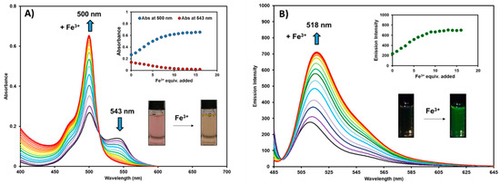 The photophysical properties of BODIPY-PH (10 µM) were investigated toward ferric ions in an aqueous solution (acetonitrile-water = 1:9 v/v). Upon constant addition of 1 molar equivalent (10 µM) to 16 molar equivalents (160 µM) of Fe3+ (10 µM increment) to the 1 molar equivalent (10 µM) of BODIPY-PH, the absorption intensities of the BODIPY derivative at 500 nm gradually increased while the intensities at 543 nm concurrently decreased resulting in a color change from pink to orange (Figure 4A). As shown in Figure 4B, the emission spectra of BODIPY-PH exhibited around a 2.5-fold increase upon adding ferric ions and the emission maxima at the concentrations of Fe3+ from low to high displayed a slightly bathochromic shift from 512 nm to 518 nm. Both absorption and emission intensities remained constant at 10 equivalents of Fe3+ added indicating ferric ion saturation for BODIPY-PH. In addition, the fluorescence quantum yield of BODIPY-PH was enhanced from 1.3 (±0.6, n = 3) % to 3.3 (±0.6, n = 3) % after additions of 10 equivalents of Fe3+. These results confirmed the potential of this pyridylhydrazone-tethered BODIPY as a fluorescence turn-on chemosensor for Fe3+ in aqueous media.