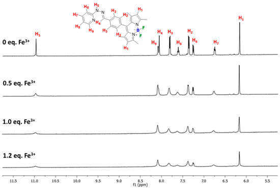 Next, the Fe3+ binding at the pyridylhydrazone (PH) unit was investigated by 1H NMR spectroscopy. As Fe3+ is paramagnetic ions that can affect relaxation times of proton-NMR spectra, the NMR resonance frequency of protons close to Fe3+ binding unit could be altered upon binding [52]. As displayed in Figure 7, the hydrazone proton signal (H4) at 8.06 ppm completely disappeared and the amine proton resonance (H5) at 10.98 ppm almost completely disappeared upon the addition of Fe3+. The rest of the proton peaks of pyridylhydrazone moiety became broader indicating that Fe3+ bound to the PH unit which is consistent with the previous findings [25,53,54]. In addition, the detections of molecular ions at m/z = 639.0923 {[(BODIPY-PH-H)Fe(NO3)(DMSO)]+} and 684.0762 {[(BODIPY-PH-H)Fe(NO3)(DMSO)(EtOH)] from electrospray ionization mass spectra (ESI-MS) confirmed the existence of iron-BODIPY complex (Figure S4).