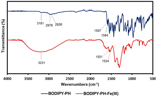 FT-IR spectroscopy was also carried out to confirm the complex formation between Fe3+ and BODIPY-PH (Figure 8). For the BODIPY-PH spectrum, the characteristic peaks at 3181, 2978, 2926, 1597, and 1584 cm−1 were assigned to N—H, Cmethyl—H, Cmethyl—H, C=N, and C=N stretching vibrations, respectively. It was observed that the wavenumbers of the N—H and C=N peaks were found at the lower frequencies than those values reported in the literature [55,56], due to the larger conjugation length. After complex formation, the broad and intense O—H peak at 3231 cm−1 regarding the H2O ligands that coordinated to the Fe3+ was detected. Moreover, the C=N peaks of the BODIPY-PH-Fe3+ complex were enlarged and shifted toward the lower wavenumbers (1551, 1524 cm−1) compared to those of BODIPY-PH. This suggested that the Schiff base nitrogen was likely to coordinate with the Fe3+ ions [57] which is agreeable with the result from NMR spectroscopic technique.