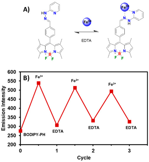 Then, the reversibility and reusability of BODIPY-PH as proposed in Figure 11A was systematically investigated by the fluorescence titration of the dye with consecutive additions of Fe3+ (100 µM) and the common metal ion sequester, ethylenediaminetetraacetic acid (EDTA) (100 µM). As displayed in Figure 11B, the fluorescence signals reached the maximum point when BODIPY-PH (10 µM) was saturated by the addition of 10 equiv. of Fe3+ (100 µM) and quenched upon the further addition of EDTA (100 µM). Nevertheless, when another 100 µM of Fe3+ was added to the resulting mixture, the fluorescent intensity was almost recovered. This off-on-off cycle could be effectively repeated up to three times confirming the practical regeneration of the BODIPY-PH after ferric ion detection.