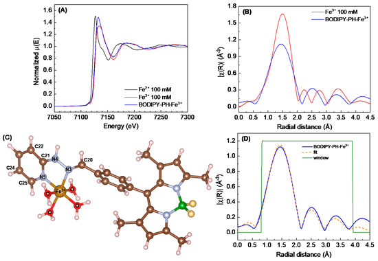 XAS spectra at Fe K-edge were collected in both XANES and EXAFS regions to reveal the structural information upon binding of Fe3+ ions to the BODIPY-PH ligand (named as BODIPY-PH-Fe3+). As shown in Figure 13A, the XANES spectrum of BODIPY-PH-Fe3+ illustrates the rather similar absorption edge and fingerprint feature with that of the standard solutions of Fe3+ in acetonitrile-water (1:9 v/v) solution. In other words, the oxidation state of Fe in the BODIPY-PH-Fe3+ remains +3 and the complexation of BODIPY-PH-Fe3+ may resemble the octahedral geometry as observed in the Fe3+ aqua complex.