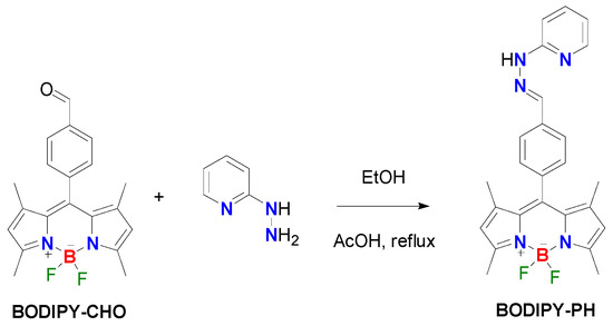 The aldehyde-functionalized BODIPY (BODIPY-CHO) shown in Scheme 1 was synthesized according to the reported procedures [28,29]. 2-Hydrazinopyridine, Dess–Martin periodinane, 2,3-dichloro-5,6-dicyanoquinone (DDQ), 2,4-dimethylpyrrole, and glacial acetic acid were purchased from Tokyo Chemical Industry (TCI), Tokyo, Japan; boron trifluoride diethyl etherate purified by redistillation, and 4-(hydroxymethyl)benzaldehyde dimethyl acetal were purchased from Sigma-Aldrich, St. Louis, MO, USA; ethanol (ACS grade) was purchased from Honeywell, Charlotte, NC, USA. Standard buffer solutions pH 1 to 12 were purchased from Merck, Darmstadt, Germany (glycine/NaCl/HCl for pH 1, Citric acid/NaOH/HCl for pH 2–6, Na2HPO4/KH2PO4 for pH 7, boric acid/KCl/NaOH for pH 8–11, Na3PO4/NaOH for pH 12). All chemicals were used without further purification. Electrospray mass spectra were obtained from a Bruker micrOTOF spectrometer (Bruker, Billerica, MA, USA). NMR spectra were recorded on a Bruker Avance 500 MHz NMR spectrometer (Bruker, Billerica, MA, USA) at ambient temperature. Chemical shifts are given in ppm and are referenced to residual 1H and 13C solvent signals. Fourier transform infrared spectroscopy (FTIR) spectra were acquired from an IRTracer-100 spectrophotometer (SHIMADZU, Kyoto, Japan). The crystallographic measurement was performed using a Bruker D8 Venture diffractometer (Bruker, Billerica, MA, USA). UV-VIS absorption and fluorescence spectra were acquired from a Cary Series UV-Vis-NIR spectrophotometer (Agilent Tech, Santa Clara, CA, USA) and a Perkin Elmer LS55 fluorescence spectrometer (PerkinElmer, Waltham, MA, USA), respectively.