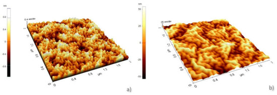 The AFM images of the surface after successive deposition of avidin and biotin onto the gold surface (Figure 5) are similar to those of the gold surface prior to deposition (Figure 3). The fact that the morphology of the surface does not change visibly after successive deposition of the proteins onto the gold indicates that the morphology of the biosensor surface is essentially given by the gold layer. The most porous surface (the one with the largest specific surface) is therefore still the one with the underlying Au surface deposited in 4 Torr Ar using 30,000 pulses. This proves the importance of the morphology of the gold layer in determining the characteristics of the sensor surface. The properties of the sensors are related to this morphology, as will be discussed below.
