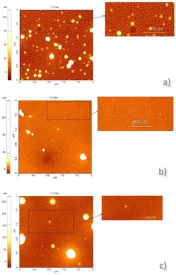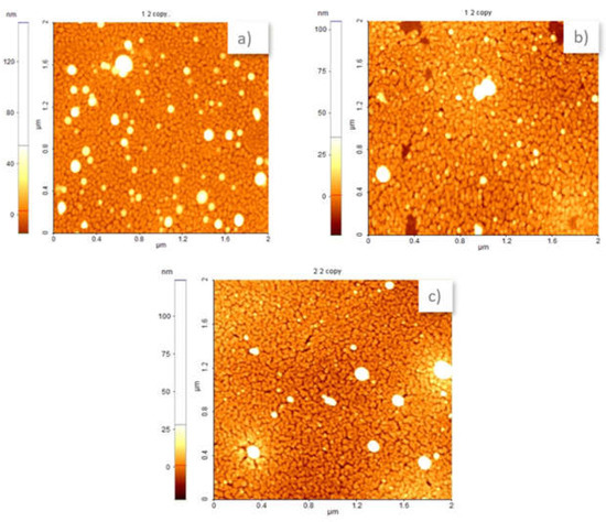 AFM images of the sensor surface after deposition of avidin or biotin/avidin on top of the Au layer: (a) avidin deposited on top of Au obtained in 1 Torr Ar using 10,000 p; (b) avidin deposited on top of Au obtained in 4 Torr Ar using 30,000 p; (c) biotin deposited on top of the avidin in (c).