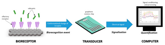 - Larisika, M.; Kotlowski, C.; Steininger, C.; Mastrogiacomo, R.; Pelosi, P.; Schütz, S.; Peteu, S.F.; Kleber, C.; Reiner-Rozman, C.; Nowak, C.; et al. Electronic Olfactory Sensor Based on A. mellifera Odorant-Binding Protein 14 on a Reduced Graphene Oxide Field-Effect Transistor. Angew. Chem. 2015, 54, 13245–13248. [Google Scholar] [CrossRef]