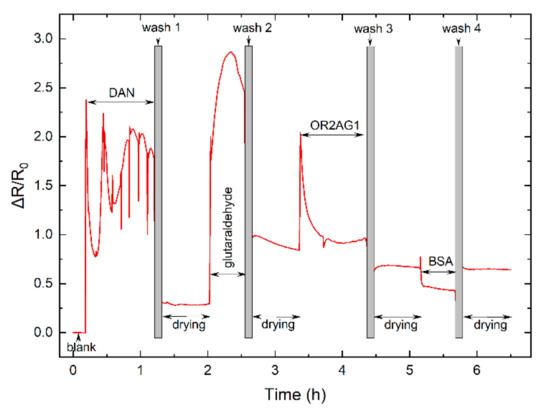 - Lee, S.H.; Jin, H.J.; Song, H.S.; Hong, S.; Park, T.H. Bioelectronic nose with high sensitivity and selectivity using chemically functionalized carbon nanotube combined with human olfactory receptor. J. Biotechnol. 2012, 157, 467–472. [Google Scholar] [CrossRef] [PubMed]