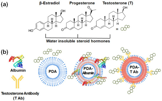 In mammalian blood plasma, water-insoluble sex steroid hormones (Figure 1a) exist as water-soluble complexes via binding to serum albumin or sex hormone-binding globulin [29,30]. Accordingly, these complexes transport and maintain the affinity of hormones in the aqueous phase. Few studies have been conducted to develop PDA-based sensors that target steroid hormones because water-insoluble hormones hardly meet and bind to PDA assemblies in aqueous media. Inspired by the hormone-albumin and hormone-globulin complexes in aqueous plasma, we utilized albumin or hormone-specific binding antibodies that could form a mediator of intermediate solubility (between water-insoluble hormones and water-dispersible PDA assemblies).