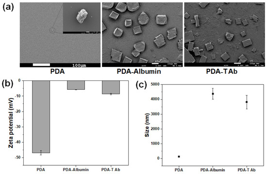 (a) SEM image of PDA, PDA-Albumin and PDA-T Ab. Scale bars represent 100 µm. The scale bar of the inset (magnified image) represents 1 µm. (b) Zeta potential values and (c) size of PDA, PDA-Albumin, and PDA-T Ab.