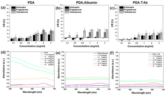 CR of (a) PDA, (b) PDA-Albumin and (c) PDA-T Ab after incubating with sex steroid hormones (β-estradiol, progesterone and T). UV-Vis absorption spectra of (d) PDA, (e) PDA-Albumin and (f) PDA-T Ab when incubating with sex steroid hormones at low (0.1 mg/mL) and high (3 mg/mL) concentrations.