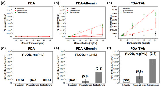 Fluorescence (FL) intensity of (a) PDA, (b) PDA-Albumin and (c) PDA-T Ab after incubation with sex steroid hormones (β-estradiol, progesterone and T). Sensitivity of sensing platforms based on (d) PDA, (e) PDA-Albumin and (f) PDA-T Ab for each sex steroid hormone. * LOD: limit of detection.