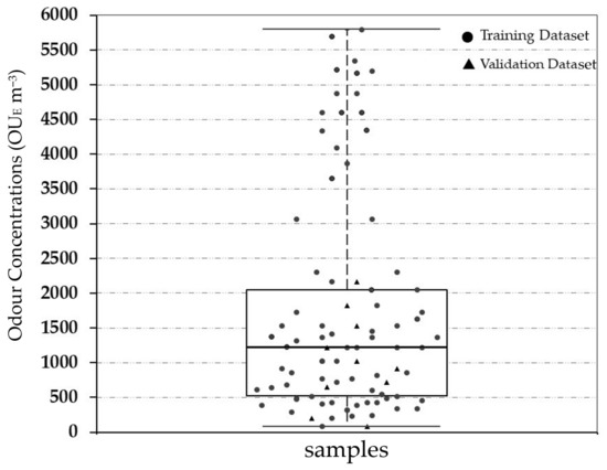 As shown, the range in terms of odour concentration of the investigated samples is between 81 OUE m−3 (min) and 5793 OUE m−3 (max), covering a wide variability of values both for the representation of emissions and of the emissions scenario. The on-site collected real odorous samples are principally located at the 4th quartile, while the diluted data were at the 1st–3rd quartile. The overall mean, variance and standard deviation is respectively equal to 1695 OUE m−3, 9.70 × 105 and 879 OUE m−3.