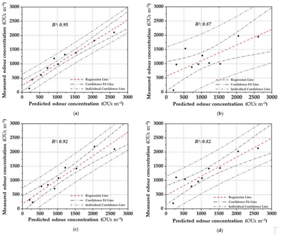 Table 4 summarises and compares the different performances of the investigated OQMMs during training and validation stages, considering the sensors’ responses as input/independent variables, and the odour concentration as output/dependent variable. In particular, the comparison between the performances was carried out by analysing the relative values, given by the difference between those calculated in terms of R2 and/or RMSE, obtained by adopting the different prediction techniques. In fact, it should be noted that the calculated R2 data, in absolute value, could be influenced by the potential reaction between the constituent substances of the samples [69].