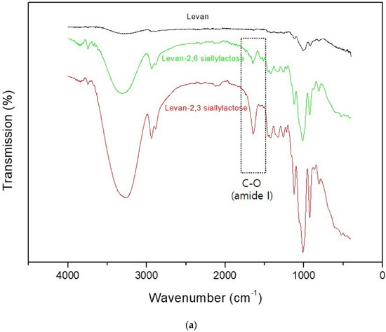 To conjugate levan to sialyllactose, an amine functional group was introduced to levan by the reductive amination method. The amine group was successfully conjugated to levan, as confirmed by a fluorescamine assay. The amine group was modified with 0.098 µmol per 1 mg of levan. Levan was conjugated to sialyllactose by the EDC coupling method, and the conjugation was confirmed by FTIR and NMR analyses (Figure 1). The IR peaks of 2, 3-sialyllactose- and 2, 6-sialyllactose-conjugated levan appeared to indicate C-O stretching (amide I 1720 cm−1), which was attributed to the amide bond for conjugation of the amine group in levan and carboxylic acid in sialyllactose. The NMR results also showed that sialyllactose successfully conjugated to levan. The protons of the COCH3 in sialyllactose were assigned to 1.9 ppm in synthetic polymers. The percentage of 2, 3-siallylactose and 2, 6-sialyllactose attachment to the amine conjugation levan was calculated to be 6.6 and 6.9 mol%, respectively, through the ratio of proton integral between glycoside moiety (3.2–4.2 ppm) and COCH3 (1.9 ppm) by NMR analysis. These results demonstrated that a similar amount of each sialyllactose was conjugated to levan.