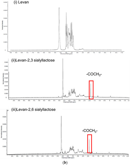 Confirmation of sialyllactose conjugated levan determined by FTIR (3200–3300 cm−1, O-H; 2930 and 2880 cm−1, C-H; 1720 cm−1, C-O amide I; and 950–1200 cm−1, fingerprint region) (a) and NMR (b) ((i) levan, (ii) 2, 3-sialyllactose-conjugated levan, (iii) 2, 6-sialyllactose-conjugated levan) (3.2–4.2 ppm, glycoside moiety; 1.9 ppm COCH3).