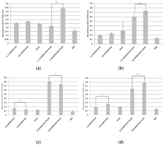 To confirm that the sialyllactose-conjugated levan interacted with HA and influenza virus, we performed a modified ELISA assay. We prepared sialyllactose-conjugated levan and sialyllactose-coated plates. The results showed that HA (Figure 2a; H1N1) and influenza virus (Figure 2b; A/California 07/2009 (H1N1)) were more strongly bound to 2, 6-sialyllactose-conjugated levan than 2, 3-sialyllactose-conjugated levan. Human influenza virus and HA are known to more specifically interact with 2, 6-sialyllactose than 2, 3-sialyllactose. To reconfirm that each sialyllactose (2, 3- and 2, 6-) successfully conjugated to levan, we also performed a lectin binding assay using MALII (Figure 2c) and SNL (Figure 2d), which are recognizable lectins that bind to 2, 3- and 2, 6-sialyllactose, respectively. The results demonstrated that MALII specifically interacted with 2, 3-sialyllactose-conjugated levan rather than 2, 6-sialyllactose-conjugated levan. In contrast, SNL was bound more preferentially to 2, 6-sialyllactose-conjugated levan than to 2, 3-sialyllactose-conjugated levan. The results demonstrate that each sialyllactose-conjugated levan successfully interacted with each recognizable lectin. These results also indicate that 2, 3- and 2, 6-sialyllactose successfully conjugated to levan. Moreover, sialyllactose-conjugated levan more highly interacted with each lectin than with sialyllactose alone via the multivalent effect. Therefore, sialyllactose-conjugated levan should efficiently bind the influenza virus.