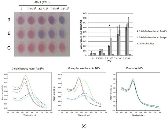 Many studies have reported that 2, 6-sialyllactose has a high affinity for human influenza virus and HA protein. We hypothesized that sialyllactose-conjugated levan formed NPs in aqueous solution via the amphiphilicity of levan. Therefore, the conjugates have high multivalent glycocluster effects due to 2, 6-sialyllactose and strongly interact with human influenza virus and HA protein. We confirmed the high binding affinity of 2, 6-sialyllactose-conjugated levan with both human HA protein (H1N1) and influenza virus. To detect influenza virus using a colorimetric assay, we fabricated levan-sialyllactose-conjugated AuNPs. Synthetic polymers act as reducing and coating agents for the formation of the AuNPs. The AuNPs were not formed using only sialyllactose, which is a coating and reducing material (data not shown). For the synthesis of AuNPs with levan-sialyllactose, no other material was needed for the gold ion reduction. Therefore, AuNPs were simply formed in one step using levan-sialyllactose. The morphology and size distribution of NPs were observed by TEM (Figure 3a) and DLS. The sialyllactose-levan-conjugated AuNPs had a spherical morphology and were monodispersed. The hydrodynamic diameters of the control AuNPs, 2, 3-sialyllactose-levan-conjugated AuNPs, and 2, 6-sialyllactose-levan-conjugated AuNPs were 18.1 nm, 20.7 nm and 17.9 nm, respectively. Synthesized NPs had red colors induced by monodispersed particles. The levan-sialyllactose-conjugated AuNPs were well dispersed and stable in aqueous solution. Generally, monodispersed AuNPs show a reddish color; however, when target molecules, such as viruses and proteins, combine with AuNPs, the NPs aggregate and change to bluish colors (Figure 3b). Therefore, AuNPs are widely used in colorimetric assays for disease detection. Several polymer (control, 2, 3-sialyllactose-levan, 2, 6-sialyllactose-levan)-conjugated AuNP samples were incubated with human influenza virus (California 07/2009). The color of the 2, 6-sialyllactose-levan-conjugated AuNPs changed after incubation with influenza virus at 3.7 × 104 pfu. However, for the 2, 3-sialyllactose-levan-conjugated AuNPs, the color of the NPs changed upon binding to virus at 7.4 × 104 pfu. Moreover, the color of the control AuNPs did not change after incubation with the virus (Figure 3c). The UV absorbance peaks also became redshifted after the binding to human influenza virus. The relative binding affinity with HA was calculated using A 680/A 525. The results showed that the 2, 6-sialyllactose-levan-conjugated AuNPs had a high value of Abs 680/Abs 525. In the case of 2, 6-siallylactose-levan, it was confirmed that Abs 680/Abs 525 increased significantly from the 7.4 × 103 PFU of H1N1 influenza virus of the control. Moreover, the value increased after incubation with higher virus concentrations. Therefore, we estimated that the limit of detection (L.O.D) of H1N1 influenza virus was 7.4 × 103 PFU using 2, 6-siallylactose-levan-conjugated AuNPs.