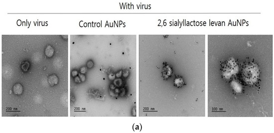 2,3-sialyllactose-levan-conjugated AuNPs, 2,6-sialyllactose-levan-conjugated AuNPs and control NPs were treated with H1N1 influenza virus (A/California/07/2009) and H5N2 influenza virus (A/aquatic bird/Korea/w351/2008) provided by BioNano Health Guard Research Center. The 100 µL of several concentration of virus were added to a 24-well plate and treated with 100 µL synthesized AuNPs and control AuNPs. After 5 min, the colorimetric change was observed by the naked eye. In addition, the absorbance of the AuNPs was measured by UV-Vis spectroscopy. NP aggregation was also observed by TEM. The samples were prepared by a method modified from previous research [39,40]. Influenza virus was purified using sucrose gradient ultracentrifugation. For the TEM analysis, purified virus (7.8 × 109 pfu/mL) was mixed with each type of AuNP for 5 min and then loaded on the carbon-coated grid. The grid was washed with water, and uranyl acetate solution was added to the grid for negative staining. The specimens were observed using TEM microscopy (JEM-1400 plus (JEOL, Japan)). Several concentrations of influenza virus and 1 mg/mL of synthesized AuNPs were mixed for 5 min. After mixing, the hydrodynamic diameter of NPs measured by dynamic light scattering (DLS; Otsuka Electronics, Osaka, Japan).