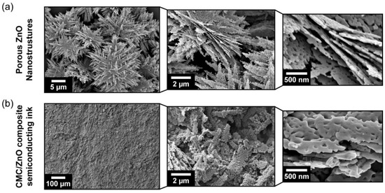 The produced porous ZnO nanostructures were blended with a concentration of 10 wt% into a previously prepared solution of 3 wt% of CMC (Mw ≈ 250,000, Sigma-Aldrich, St. Louis, MO, USA) dissolved in deionized water. The mixture was slowly stirred at 200 rpm for 4 h to obtain a well dispersed and homogeneous white viscous solution. The ink was stored in a refrigerator at 3 °C until being used.