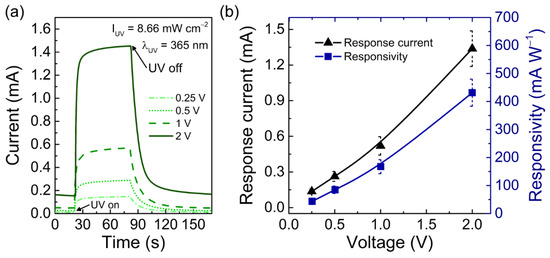 Figure 4a,b depict the average photocurrent of the UV sensors under different applied voltages (0.25, 0.5, 1, and 2 V) and the corresponding response current (ΔI) and responsivity. The bias voltage plays an important role in the electron–hole pair separation, recombination, and transportation processes and, therefore, it determines the overall photoresponse of the UV sensor [78]. The response current of the sensor increased almost linearly from 0.14 ± 0.02 to 1.34 ± 0.15 mA when the applied voltage is varied from 0.25 to 2 V, respectively. Typically, ZnO nanostructures present high recombination rates, low carrier mobilities, and high resistivities [77,78], which means that applied voltages above 1 V are usually needed to obtain a good response to UV light [78]. In this work, the sensors presented a very good responsivity even for low applied voltages (<2 V), reaching a value of 43.9 ± 6.8 mA W−1 for 0.25 V. The low-voltage operation of the fabricated screen-printed sensors is compatible with the emerging concept of IoT and demonstrates that these devices can be powered by portable power supplies, such as thin-film batteries or solar cells [5,12,18,95]. To the best of our knowledge, this is the first report showing low-powered and low-cost ZnO-based UV sensors on paper substrates with a response current in the mA range, as previously evidenced by Table 1.