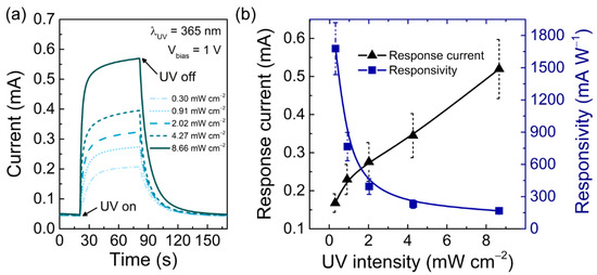 Figure 5a,b show the average photocurrent for different UV light intensities and the calculated response current and responsivity for an applied voltage of 1 V. In Figure 5b, the sensors’ response current increases with UV light intensity, shifting from 0.17 ± 0.02 mA for an intensity of 0.30 mW cm−2 to 0.52 ± 0.08 mA for an intensity of 8.66 mW cm−2. The UV light intensity is proportional to the number of photons irradiating the porous ZnO nanostructures for a certain UV wavelength. As such, when the UV intensity increases, the number of incident photons is higher and, consequently, more carriers are generated, and the response current is increased. On the other hand, the sensor’s responsivity decreases with increasing UV irradiance. This is expected since the response current remains in the same order of magnitude (10−1 mA) while the incident UV light power increases from 0.30 to 8.66 mW cm−2. As a result, the calculated responsivity (mA W−1) decreases with increasing UV light intensity. More importantly, the obtained results indicate that the produced UV sensors can respond to much weaker UV light, making these sensors suitable for the detection of low levels of UV light.