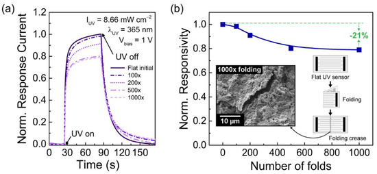 (a) Comparison of the normalized response current of a single screen-printed ZnO UV sensor in a flat position before and after being folded up to 1000 successive times. (b) Normalized responsivity of the UV sensor as a function of the number of folds. Inset of an illustration of the folding process and an SEM image showing the resulting cracks in the folding crease line of the sensor after being folded 1000 consecutive times.