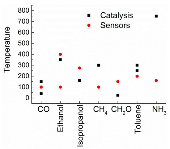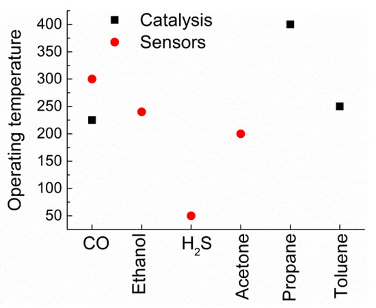 | CO oxidation, total oxidation of methane, propane, toluene | Fe2O3 | Acetone, ethanol, butanol, H2S |