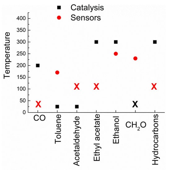 | CO oxidation, total oxidation of methane, ethanol, ethyl acetate, benzene, toluene, acetone, isopropanol, etc. | Perovskites (ABO3 general composition) | Methanol, ethanol, ammonia, alkanes, H2S, SO2, acetylene |