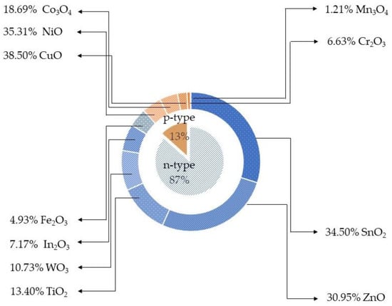 Metal oxide (MOX) semiconductors may be divided in two different groups depending on their majority carriers. For instance, in n-type MOX semiconductors, such as ZnO, In2O3, Fe3O2, TiO2, WO3, SnO2, the majority carriers are electrons, while in p-type, NiO, Co3O4, Cr2O3, Mn3O4, CuO, the majority carriers are holes [13,14,15]. In contrast to n-type MOX gas sensors, p-type MOX ones are less studied, and the reported works are still in a premature stage of development. Figure 1 shows the results of p-type and n-type MOX gas sensors in Web of Knowledge on 30 June 2021 with the key word “metal oxide gas sensor.” Only 13% articles report on the p-type MOX gas sensors out of a total of 24,234 articles concerning MOX gas sensors. Irrespective of the number of reported works, p-type metal oxides have shown excellent performances in chemical/gas sensing owing to the majority of charge carriers, their conduction paths, resistance to humidity influence on sensing performances, superior catalyst properties, long-term stability, and lower open circuit resistance in contrast to n-type MOX gas sensors [16]. Furthermore, oxygen is excellently adsorbed at p-type MOX surface at low temperature compared to n-type. Thereby p-type MOX gas sensors could potentially be used for the sensing of volatile organic compounds (VOCs) since they are highly oxidized by adsorbed oxygen at the surface compared to surface lattice oxygen [17,18,19]. Moreover, the excellent gas-sensing performances at low working temperatures in p-type MOX gas sensors have paved the interest for the detection and quantification of VOCs [16]. Thereby, the number of scientific research works were gradually increased on p-type MOX as shown in Figure 2.