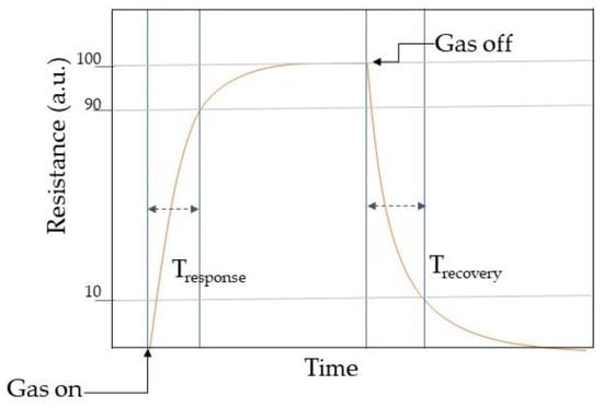 Response may be described as the fraction of the resistance on the sensing material when interacting with the analyte gas (Rg) and the one in air (Ra). However, response vastly relies on the crystallite size, porosity, operating temperature, and film thickness. Selectivity determines the ability of identifying the target gas in a mixture of gases and can be tuned with the operating temperature. However, MOX chemical/gas sensors may respond in similar manners toward different gas molecules [46]. Hence the selectivity is one of the paramount features when describing the sensing performances. Stability is the ability of the active material to keep its properties, such as electrical resistance in case of conductometric sensors, constant over time. Response time is an evaluation of the sensors dynamics to achieve a stable value of the monitored sensor parameter, for example the time to accomplish 90% of the final resistance of the sensor when interacting with the gas. Usually, the electrical resistance of a conductometric chemical/gas sensors changes when interacting with the analytes molecules as shown in Table 1. In general, a dynamic response curve shows the resistance/conductance variation of the sensor with time. While the recovery time may be calculated as the time interval necessary to get back to 90% of the resistance value in air before the gas introduction as the air flow is restored. These parameters can be calculated from the dynamic response plot as shown in Figure 4. Detection limit is the least concentration of analyte gas that may be detected by the sensor. Lastly, working temperature is the temperature where the sensor is operating.