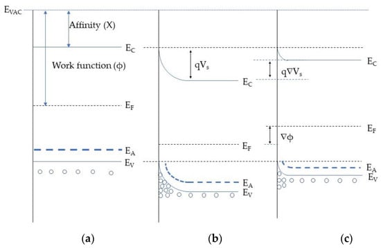 In addition to the conduction model by Barsan et al. an overlook on the MOX band structure modification with the chemisorption of these species could be interesting. Figure 7a depicts the band structure prior to any surface reaction. Once oxygen is ionosorbed on the MOX surface, electron from the valence band are captured on the surface traps. This process alters the hole concertation in the accumulation layer resulting in upward band bending as represented in Figure 7b. Subsequently, the electrical resistance of the hall accumulation layer decreases [49]. The interaction of the reducing gas with sensing material may increase the HAL resistance due to the consumption of ionosorbed species. This results in the decrease of the hole concentration causing a downward band bending as in Figure 7c. Furthermore, direct adsorption of oxidizing species, such as highly electronegative NO2, can also alter the MOX electrical conductance and a detailed explanation has been reported in Comini et al. [5]. Additionally, energy band bending due to the electron transfer between the semiconducting material and the chemical compounds, formation of Schottky barriers, microstructure of the MOX semiconductor also influence the electrical resistance [47,50].