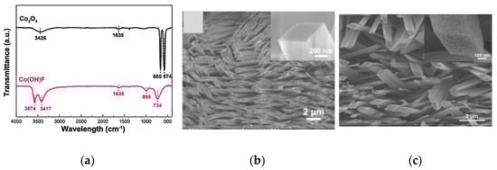 FTIR spectra of the Co3O4 NRs: (a) before and after sintering at 450 °C; (b) SEM images of Co(OH)F NR; (c) SEM image of the rhombus-shaped Co3O4 NR arrays annealed at 450 °C. Reprinted with the permission from [25].