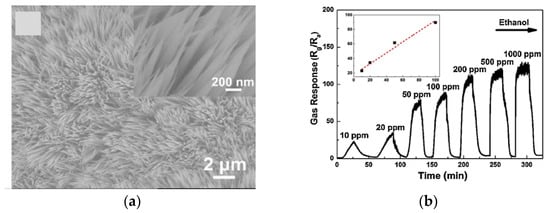 The detection of lower concentrations is highly beneficial when considering safety applications. One successful study has reported the detection of 10 ppm C2H5OH exploiting needle shaped Co3O4 nano arrays (Figure 12a) that were grown in facile hydrothermal route by Wen et al. in 2014 [34]. The reported nanoneedles array has demonstrated mesoporosity and quasi-single-crystalline structure which has been identified as the main motivation for the superior response of 89 (Rg/Ra) toward 100 ppm ethanol at a working temperature of 130 °C (Figure 12b). Furthermore, several other key factors, such as the strong adhesion between the sensing materials and the substrates, which in turn improve the good ohmic contact, the random orientation of the nanoneedle arrays and the special exposed crystal planes of Co3O4 have been ascribed for the superior sensing performance and their stability.