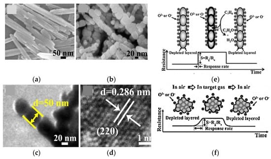 The FESEM:(a) as grown; (b) calcinated at 450 °C for 3 h; (c) TEM and; (d) HRTEM of the calcinated Co3O4 nano rods. The illustration of gas-sensing mechanism; (e) Co3O4 nanorods; (f) commercial Co3O4 powder. Reprinted with the permission from [27].