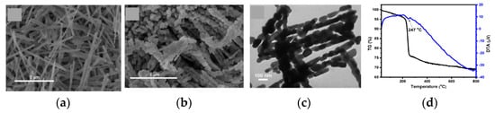 Electrospinning technique is performed injecting a liquid precursor solution via a spinneret. In general, high electrical voltage difference is applied between the liquid precursor and the collector, which leads to an extrude on the solution forming a jet from the nozzle. The jet-formed fibers are deposited on the collector [46]. This method of growing nano structures with higher length is simple and flexible specially for the nano fibers’ growth. However, electrospinning is controlled by several parameters, such as operating voltage, viscosity, pressure, flow rate, and temperature [60]. Presently, two standard electrospinning setups are available; horizontal and vertical and a comprehensive study on electrospinning techniques is found in Bhardwaj et al. [61]. Additionally, a post growing heat treatment is essential in the electrospinning technique to eliminate the solvent and to solidify the nano structures. Figure 10a,b shows the general electrospinning setup and Figure 10c–f the SEM images of different achieved Co3O4 NFs. However, with the advancement of this technology, some research groups have introduced state-of-the-art systems that can grow more graded nano fiber structures at higher efficient and controllable means.