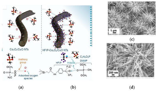 Wang et al. have reported Co3O4 NRs-assisted gas sensors for toluene detection [27]. The grown rods-like structures were oriented from the assembly of numerous fine nanoparticles. The Figure 16a,b shows NRs with 40–50 nm width and cubic spinel Co3O4 phase. The sensors have shown an excellent response of 6 (Rg/Ra) toward 10 ppm of toluene and 35 (Rg/Ra) for 200 ppm at 200 °C together with response and recovery time of 90 s and 55 s respectively. Furthermore, higher sensing response has been obtained in rod-like structure, compared to nanoparticle, due to the higher amount of adsorbed oxygen molecules and the easiest diffusion of toluene through the well-aligned porous structures. This in turn improves toluene molecules absorption in the rod-like Co3O4 surface as depicted in Figure 16c,d. Once toluene molecules interact with the pre-adsorbed oxygen, the following reaction takes place on the surface of Co3O4: